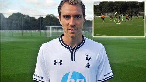 Pha solo hoàn hảo của Eriksen trên sân tập NỘI DUNG SẼ XUẤT HIỆN TẠI ĐÂY. Trong buổi tập mới đây, cầu thủ này đã ghi một bàn thắng đẹp với pha solo qua 3 cầu thủ trước khi tung ra cú sút không thể cản phá. Tân binh Christian Eriksen nhiều khả năng sẽ có màn ra mắt trong trận đấu mà Totteham tiếp Norwich trên sân nhà White Hart Lane (ngày 14/9).